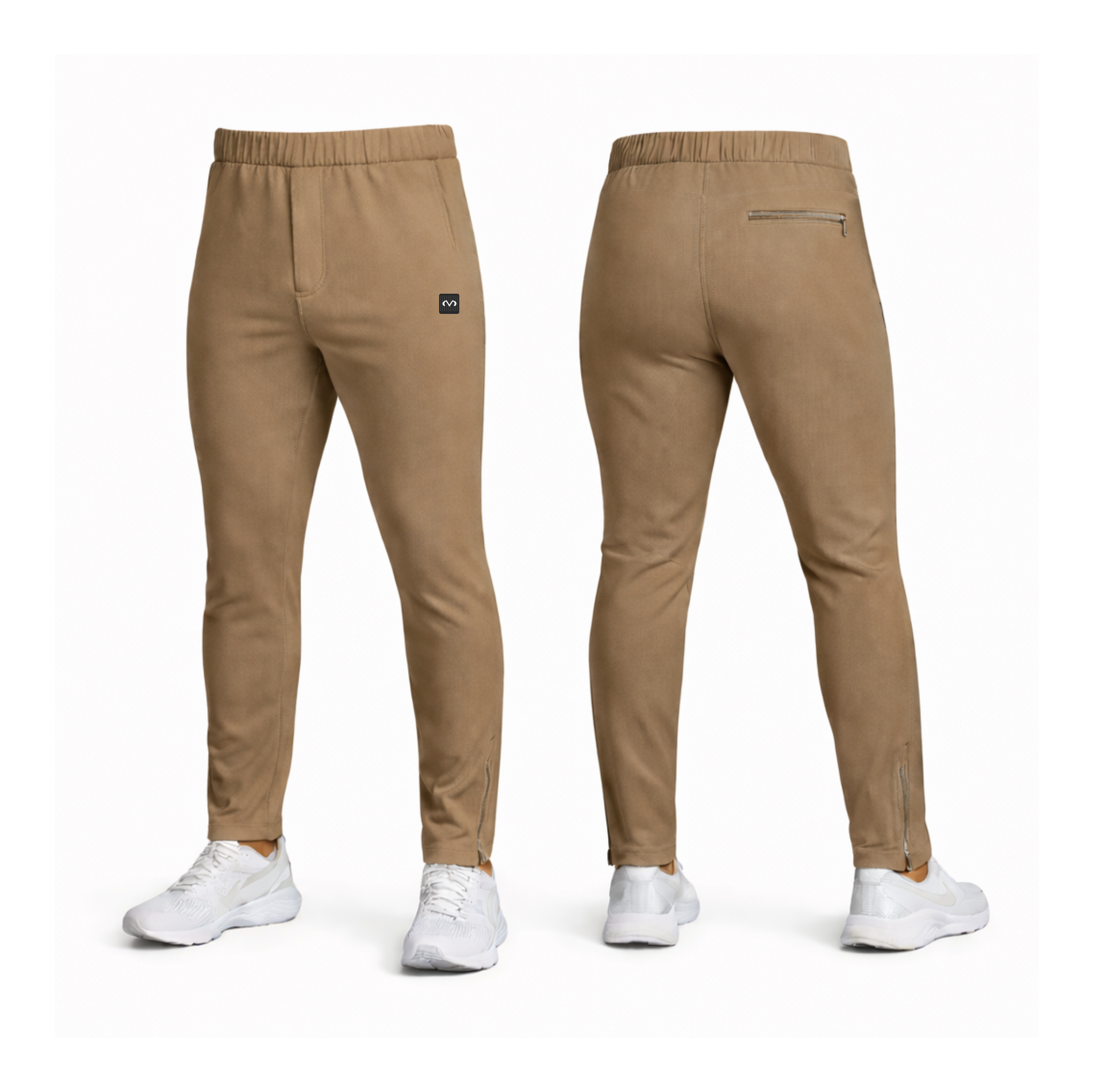 Athletic 4 way stretch fabric pants with elastic waistband and draw string. Side pockets and a single back pocket with zipper. Taper leg fit with zipper bottoms.